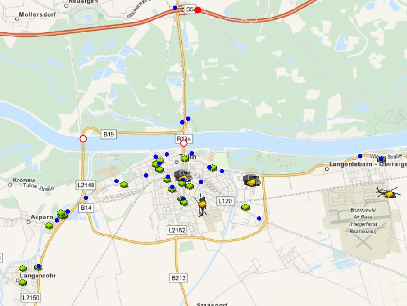 Let’s refer to the following disaster relief setting. It assumes random and dynamic demand to be served by relief forces. Each shipment originates north of the river and has to be brought to a store south of the river, denoted in green. Transshipment of goods can only be performed at one of the blue dots, however, due to operational constraints, only a limited number of transshipment points can be operated simultaneously. Consequently, the solution procedures have to find the best set of points considering various uncertainties in the system. To accomplish this, the system runs a Tabu Search, which uses an agent-based simulation to evaluate solutions and model randomness. Furthermore, routing and GIS integration is facilitated.